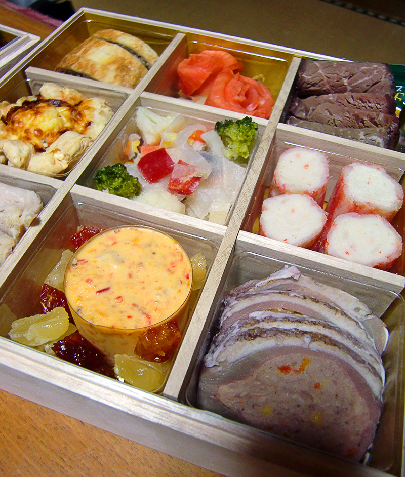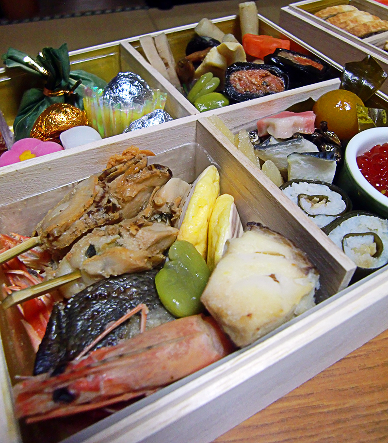 One other thing to note is that the osechifood all have a form of symbolism. I’m not adept at identifying these symbols but I can identify a few. The shirmp/prawn represents the will to live until the point your back arches like that of a shrimp. The first picture in the following set has a photo of a lotus root which you can imagine why you can use it as a lens to see your future. The photo is towards the lower right of the photo.
